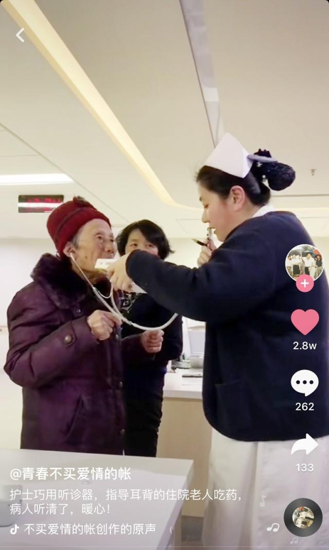 <span style="white-space:pre"> </span>“一天吃幾個呀?”<br /><br /> “一天三次,一次兩顆!”<br /><br /> “哦,一天三次,哦哦。”<br /><br /> 短短的三句話,15秒。<br /><br /> 一條護士用聽診器當“臨時助聽器”,為一位耳背老奶奶講解用藥方法的抖音視頻在網上熱傳。<br /><br /> 視頻中的老奶奶是住在醫院的79歲老人,有點耳背,用聽診器說話的是護士黃艷,拍攝者是另一位護士蔣夢婷。當時,老奶奶不知怎么吃藥,小黃喊了半天,奶奶也沒聽清,于是靈機一動,就把聽診器用上了。一旁的小蔣順手就把視頻分享到微信朋友圈里。<br /><br /> 友好醫院工作人員把這段視頻做成一條抖音視頻,以網名“青春不買愛情的帳”發送。“青春不買愛情的帳”說,本來就想與同事和朋友分享一下醫院護士既機智又暖心的行為,沒想到僅一天的工夫,竟獲百萬點擊量,數萬個贊。<br /><br /> “看到節節飆升的點擊量,我非常激動。”“青春不買愛情的帳”說,可以看出人們對醫護人員這個行業的關注。<br /><br /> “我們對老人一個小小的關愛行為,竟引起網友的強烈反響,可以看到我們社會充滿愛。”<br /><br /> 除了熱情點贊,還有不少網友發表了評論。<br /><br /> “給這個職業的工作者點贊,她們的真的很偉大,也很不容易。”<br /><br /> “最美護士!”<br /><br /> “太贊了,真是暖心一幕。”<br /><br /> “這個職業工作者不容易,為這個護士姐姐點贊。”<br /><br /> 還有的網友打趣,表示學到了一招:“太有才了,聽診器開發出新用途。”<br /><br /></span><p><span style="font-size:16px;"> “對這個可以。心臟不好的聽心臟;肺不好了聽肺;嗓子不好了,可以當喇叭使;耳朵不好了可以當助聽器。”</span></p><p style="text-align: center;"><span style="font-size:16px;"><img src="/upfiles/201907240350126074.jpg" alt="" /><br /></span></p>" />