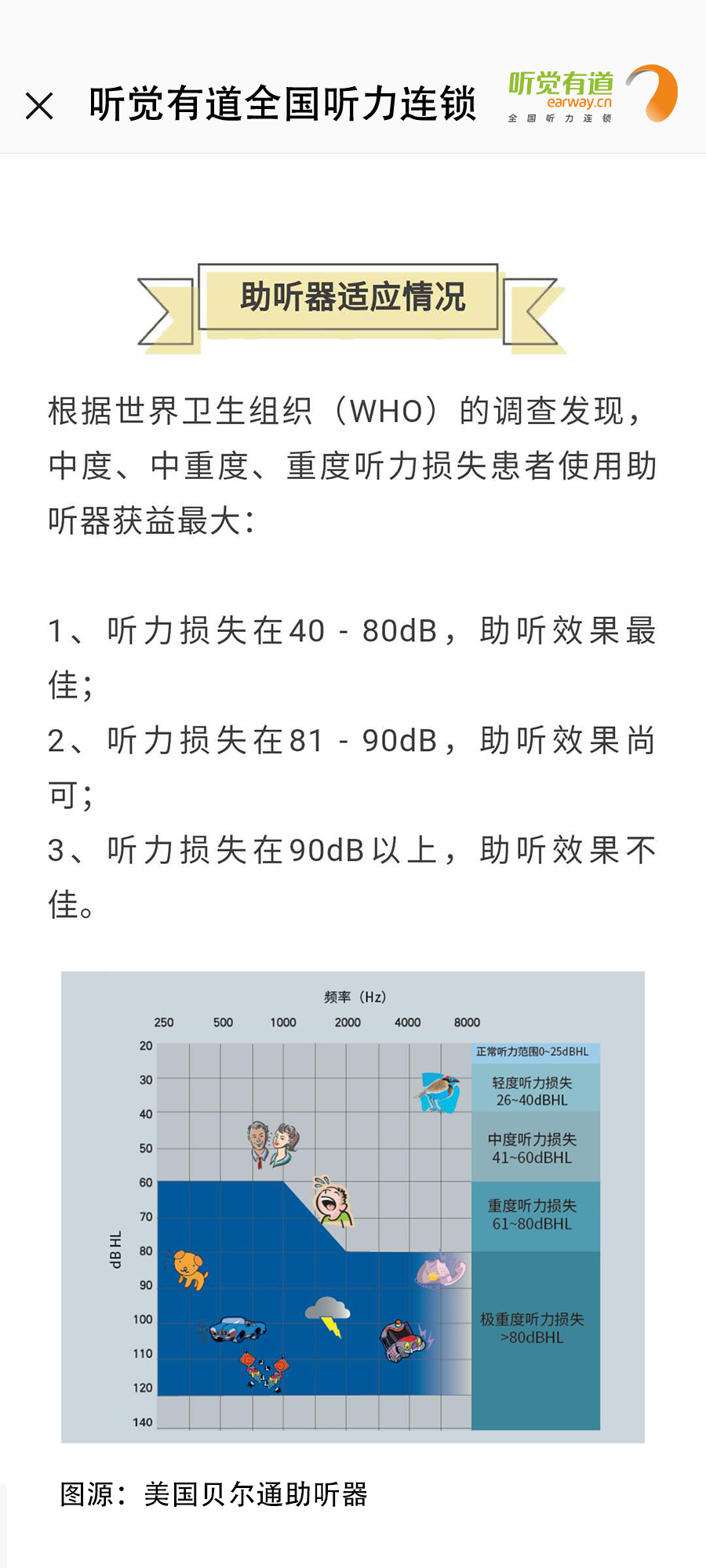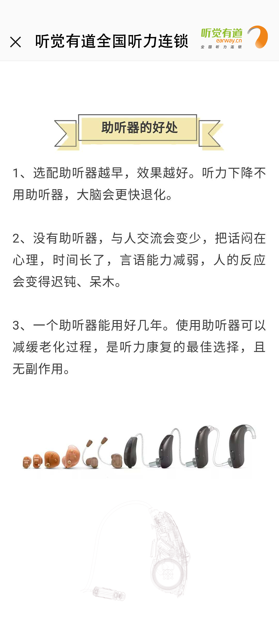 什么是助聽器?長什么樣子?有什么作用?如何使用?這里一一告訴您!</p><p> 助聽器是聽力障礙者使用的輔具,用來補足聽力損傷所造成的缺陷。廣義上講凡能有效地把聲音傳入耳朵的各種裝置都可以看作為助聽器,狹義上講助聽器是一個電聲放大器,通過它將聲音放大,使聽障者聽到了原來聽不清楚、聽不到的聲音。</p><p> 第一:助聽器的種類</p><p style="text-align: center;"><img src="/upfiles/201901180318143583.jpg" width="640" alt="" /><br /></p><p> 第二:助聽器的好處</p><p style="text-align: center;"><img src="/upfiles/201901180318334139.png" width="640" alt="" /><br /></p><p> 第三:如何適應助聽器</p><p style="text-align: center;"><img src="/upfiles/201901180318506440.jpg" width="640" alt="" /><br /></p><p> 第四:選配助聽器流程</p><p style="text-align: center;"><img src="/upfiles/201901180319039646.jpg" width="640" alt="" /><br /></p><p style="text-align: center;"><br /></p><p> 更多詳情請登錄m.padesign.cn</p>" />