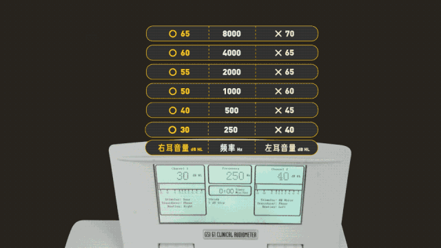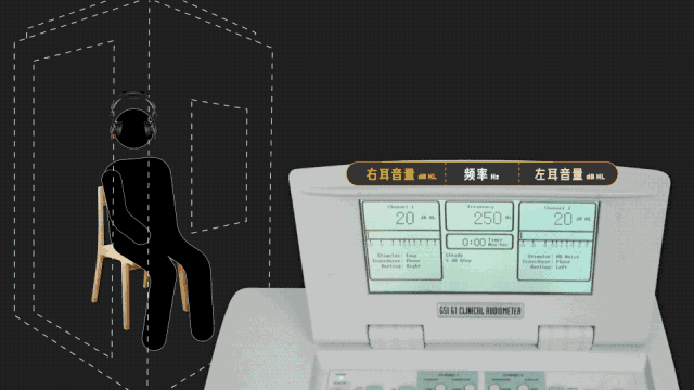 首先,受試者需在隔音間內戴上耳機。外面的聽力計會放出特定頻率的聲音,并持續提高音量,直到受試者示意能聽到聲音,此時的音量大小稱為聽閾級。