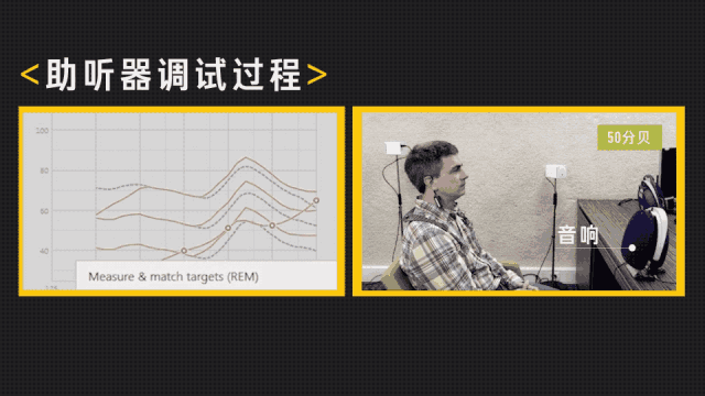 接著,患者面前的音響會播放一段 50 分貝的語音,這時,耳朵中的探管麥克風就能接收到助聽器放出的實際音量,也就是這條綠線。