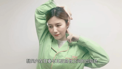 翳風穴在耳垂和耳后高骨之間的凹陷處,先向前旋轉按摩10圈,再反方向按摩10圈。再換另一只耳朵進行同樣的操作。