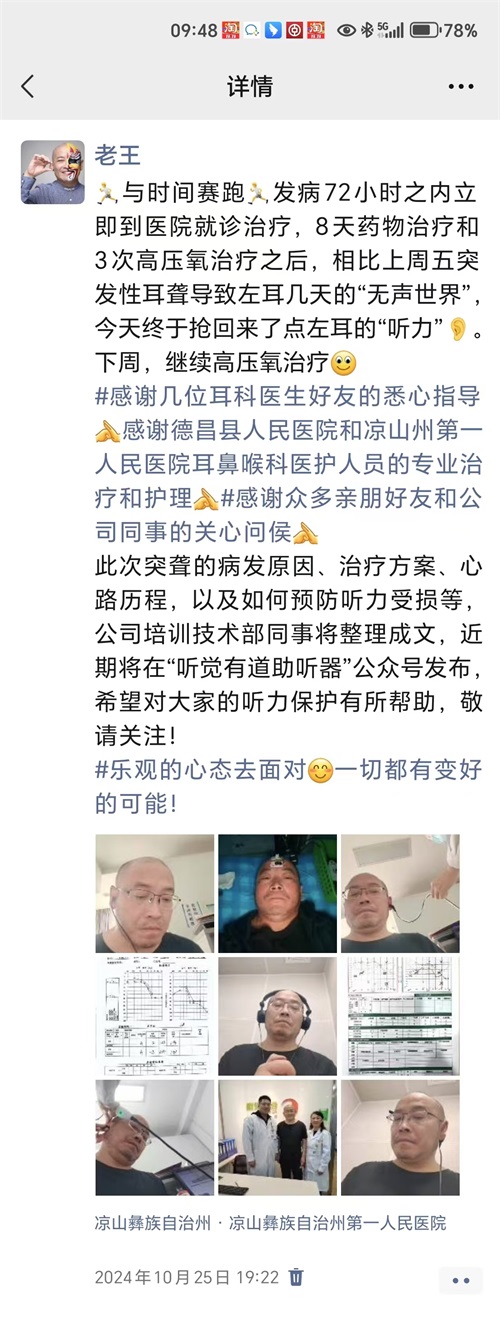 在這個快節奏的世界里,每一個細微的聲音都承載著生活的溫度。然而,突如其來的聽力挑戰,卻讓這份美好變得模糊。<br /><br /><br />聽覺有道全國聽力連鎖聯合創始人王曉剛先生,期間或因工作過度操勞,于2024年10月16日的夜晚,耳道內突然響起了一聲“砰”的異響。次日,他的耳內又相繼出現了“噗噗”聲、“滋滋”聲的雜音,與人交談時,聽不清、甚至聽不到對方的話語變得愈發顯著。<br /><br /></span><p><span style="font-size:16px;">以下任何一項癥狀單獨或突發性耳聾的發病原因及發病機制尚不明確,多認為與病毒感染、腫瘤性病變、自身免疫疾病、藥物中毒內耳缺血等因素相關。<br />過度勞累,焦慮、精神壓力及相關心理因素等被認為是常見的誘發因素。伴隨出現,均有可能是突發性聾:<br />1、突然發生的主觀聽力下降(但是根據聽力損失的程度以及頻率不同,不是所有的病人都有聽力下降的感覺)<br /><br /><br />2、耳鳴(約90%)<br /><br /><br />3、耳悶脹感(50%以上)<br /><br /><br />4、眩暈、惡心、嘔吐(30%~50%)<br /><br /><br />5、聽覺過敏或重振(表現為對聲音異常敏感或者異常遲鈍,導致刺耳感或者失真感)<br /><br /><br />6、耳周感覺異常:(如麻木感、針刺感等不適感覺(全聾患者常見))<br /></span></p><p><span style="font-size:16px;">18日下午,當他嘗試堵住右耳,竟發現左耳幾乎無法捕捉到外界的任何聲響。此刻,王總深刻意識到,自己的聽力出現了嚴重問題,于是立即趕往當地醫院耳鼻喉科進行檢查,最終被確診為突發性耳聾。</span></p><p><br /></p><p style="text-align: center;"><img src="/upfiles/202411140426063076.jpg" alt="" /><br /></p><p><br /></p><p><span style="font-size:16px;">回想起發病初期,王總表示,當自己突然失去聽力,完全與外界隔絕的那一刻,內心充滿了無助與恐懼。幸運的是,由于他長期深耕聽力行業,對聽力受損有著較為深入的了解、明白:突聾聽力救治時間為黃金72小時內。因此能夠識別癥狀并及時就醫,從而得到了有效的治療。<br /><br /><br />然而,如今仍有許多患者對聽力健康的信息了解不足,錯過了最佳的治療時機,最終形成不可逆的聽力損傷,給日常生活、工作中帶來嚴重交流障礙。</span><br /></p><p><br /></p><p style="text-align: center;"><img src="/upfiles/202411140428078193.jpg" alt="" /><br /></p><p style="text-align: center;"><img src="/upfiles/202411140429087669.jpg" alt="" /><br /></p><p style="text-align: center;"><img src="/upfiles/202411140429178890.png" alt="" /><br /></p><p style="text-align: center;"><br /></p><p style="text-align: center;"><span style="font-size:16px;color:#ff9900;"><strong>什么是突發性耳聾?</strong></span></p><p style="text-align: center;"></p><div style="text-align: left;"><span style="font-size:16px;">醫學全名:突發性不明原因性聽力損失。</span></div><span style="font-size:16px;"></span><div style="text-align: left;"><br /></div><div style="text-align: left;"><br /></div><div style="text-align: left;">簡稱:突聾</div><div style="text-align: left;"><br /></div><div style="text-align: left;"><br /></div><div style="text-align: left;">根據中國2015年版《突發性聾診斷和治療指南》,突發性耳聾目前定義為:是指72小時內突然發生、原因不明的感音神經性聽力損失,至少在相鄰的兩個頻率聽力下降≥20dBHL。</div><div style="text-align: left;"><br /></div><div style="text-align: left;"><br /></div><div style="text-align: left;">近年來“突發性耳聾”患者年輕化趨勢明顯,年輕人患病比例增加了三至四成。耳蝸中的聽覺毛細胞一旦受損,在一定時間內得不到及時治療,將不能再生。</div><div style="text-align: left;"><br /></div><div style="text-align: left;"><br /></div><div style="text-align: center;"><strong><span style="color:#ff9900;">臨床表現</span></strong></div><p></p><p><span style="font-size:16px;">突聾一般單側發病,個別情況下可以雙側發?。?1/10雙側);</span><br /></p><p><span style="font-size:16px;"><br /></span></p><p style="text-align: center;"><span style="font-size:16px;color:#ff9900;"><strong>原發狀態</strong></span></p><p><span style="font-size:16px;">以下任何一項癥狀單獨或伴隨出現,均有可能是突發性聾:<br />1、突然發生的主觀聽力下降(但是根據聽力損失的程度以及頻率不同,不是所有的病人都有聽力下降的感覺)<br /><br /><br />2、耳鳴(約90%)<br /><br /><br />3、耳悶脹感(50%以上)<br /><br /><br />4、眩暈、惡心、嘔吐(30%~50%)<br /><br /><br />5、聽覺過敏或重振(表現為對聲音異常敏感或者異常遲鈍,導致刺耳感或者失真感)<br /><br /><br />6、耳周感覺異常:(如麻木感、針刺感等不適感覺(全聾患者常見))<br /></span></p><p><span style="font-size:16px;"><br /></span></p><p style="text-align: center;"><span style="font-size:16px;color:#ff9900;"><strong>繼發狀態</strong></span></p><p><span style="font-size:16px;">恐懼,焦慮;耳鳴帶來的心理、睡眠干擾等,嚴重影響生活質量。<br /></span></p><p><span style="font-size:16px;"><br /></span></p><p style="text-align: center;"><span style="font-size:16px;color:#ff9900;"><strong>誘發因素</strong></span></p><p><span style="font-size:16px;">突發性耳聾的發病原因及發病機制尚不明確,多認為與病毒感染、腫瘤性病變、自身免疫疾病、藥物中毒內耳缺血等因素相關。<br />過度勞累,焦慮、精神壓力及相關心理因素等被認為是常見的誘發因素。<br /></span></p><p><span style="font-size:16px;"><br /></span></p><p style="text-align: center;"><span style="font-size:16px;color:#ff9900;"><strong>治療</strong></span></p><p><span style="font-size:16px;">一旦出