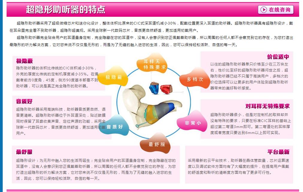 <span style="font-size:16px;">  真正意義上的隱形助聽器應該是invisible in canal,也就是IIC。IIC采用了更先進的芯片和設計,體積比原來的深耳道式助聽器(CIC)還要小20%以上,放置位置是在耳道的深處。</span></p><p><span style="font-size:16px;">  需要注意,隱形助聽器戴在耳朵,在外面看是完全看不到助聽器的,不會被人發現有在佩戴助聽器,而且音質、安全性、便攜性等各方面也做得非常好,特別適合對外形和性能上有高要求的用戶。</span></p><p><span style="font-size:16px;">  隱形助聽器的選配須知</span></p><p><span style="font-size:16px;">  1、隱蔽性極高</span></p><p><span style="font-size:16px;">  目前最小的助聽器機型,無論從體積還是外殼厚度上,都比其他助聽器要小很多,從外面觀察基本完全看不到機身,做到真正意義上的“隱形”。</span></p><p><span style="font-size:16px;">  2、舒適清晰</span></p><p><span style="font-size:16px;">  位于外耳道深處,更接近耳膜,保留了耳廓收集聲音、聲源定位的功能,采用新一代的高科技芯片,晶體管數量、芯片運轉速度都性能極好,音質舒適自然,聽起來更清晰。</span></p><p><span style="font-size:16px;">  3、高端機型</span></p><p><span style="font-size:16px;">  外形和性能近乎完美結合,“隱形”的特性極為迷人。隱形助聽器屬于高端機型,一般價格都不會低,至少上萬元,不過其帶來的美好聆聽感受是無與倫比的。</span></p><p><span style="font-size:16px;">  4、對耳樣無特殊要求</span></p><p><span style="font-size:16px;">  對定制機的取樣無特殊要求,只要在標準CIC耳樣的基礎上超過第二彎道3mm即可。第二彎道處的耳樣厚度或寬度只要達到6mm以上即可。</span></p><p><span style="font-size:16px;">  </span></p><center><img src="/upfiles/201712130407572536.jpg" alt="" /><br /></center>" />